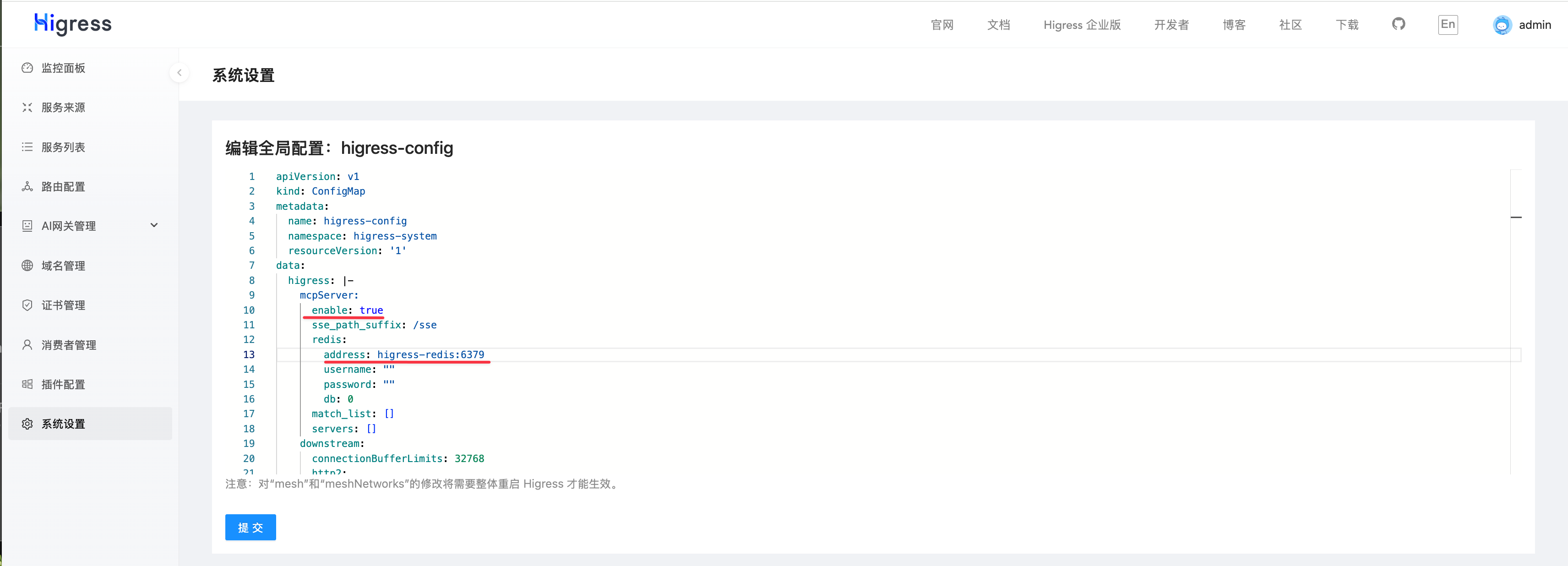 --network mcp higress-registry.cn-hangzhou.cr.aliyuncs.com/higress/redis-stack-server:7.4.0-v3Higress 容器启动成功以后,可以通过 http://localhost:8001 访问 Higress Dashboard。进入 系统配置 页面,启用 mcpServer 功能,并配置 Redis 地址。由于 higress-redis 与 higress 容器位于同一 Docker 网络中,因此可以直接通过容器名进行访问。
