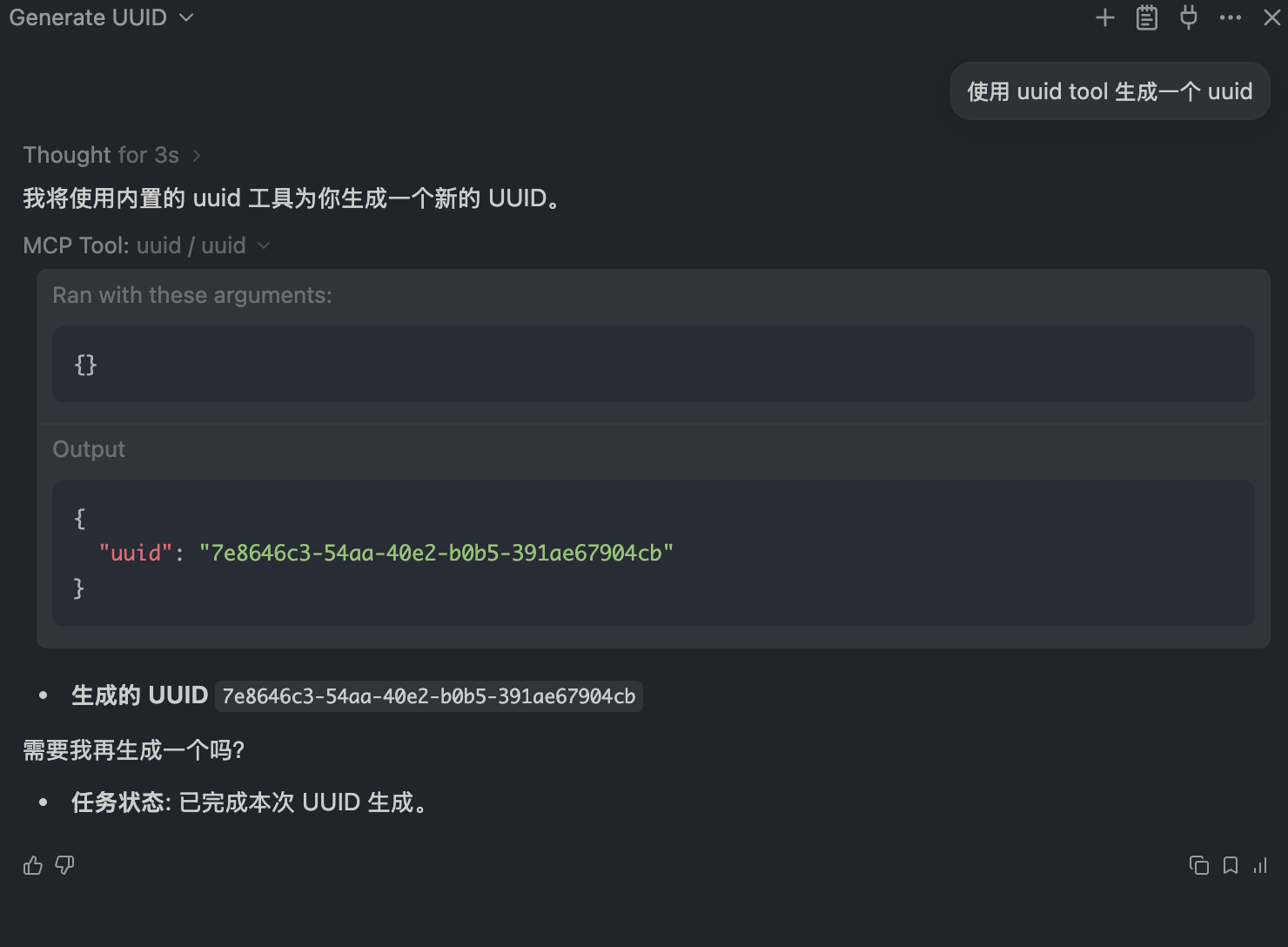 }让 Windsurf 调用 MCP 工具生成一个随机的 UUID。