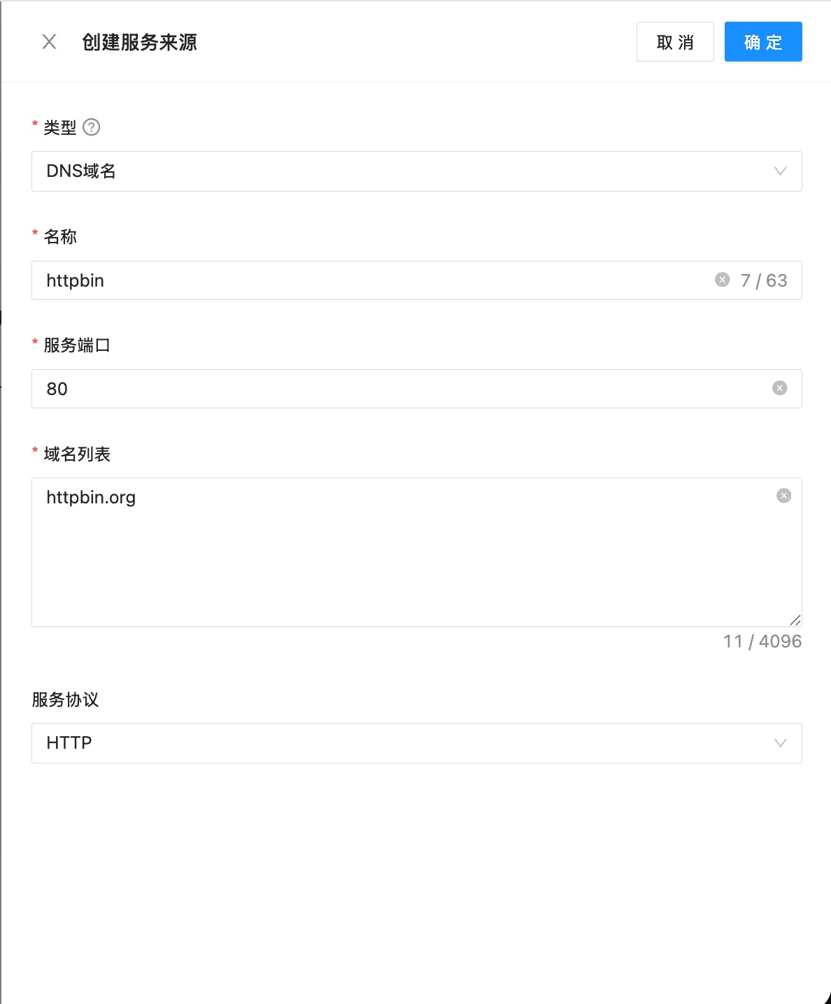 在 Higress 控制台添加目标 REST API 的服务来源。本示例使用 httpbin.org 作为服务来源。