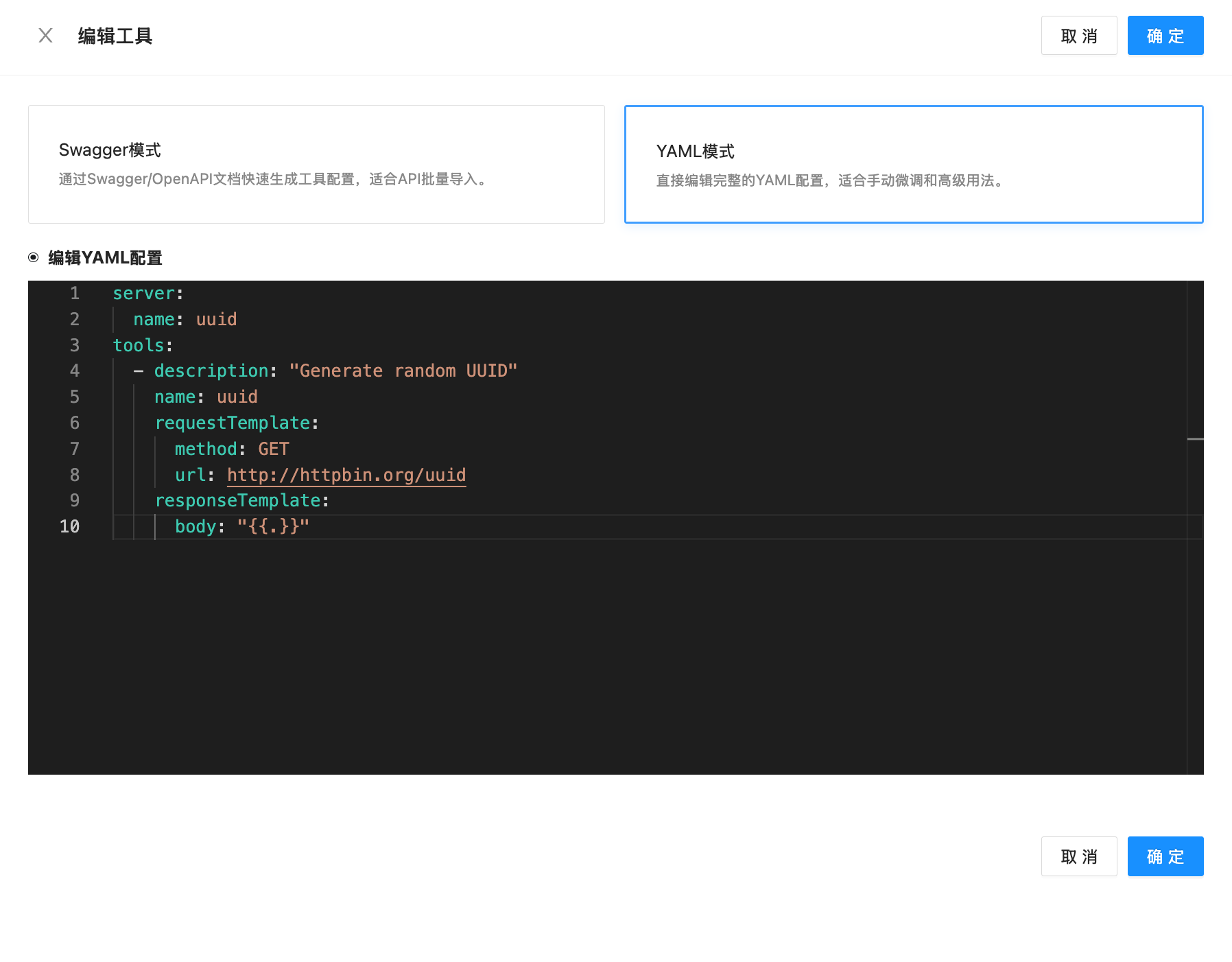 配置 OpenAPI 类型的 MCP 服务,需要在创建后编辑工具,可以使用 OpenAPI/Swagger 规范或者配置 MCP YAML 配置,这里以 MCP YAML 配置为例: