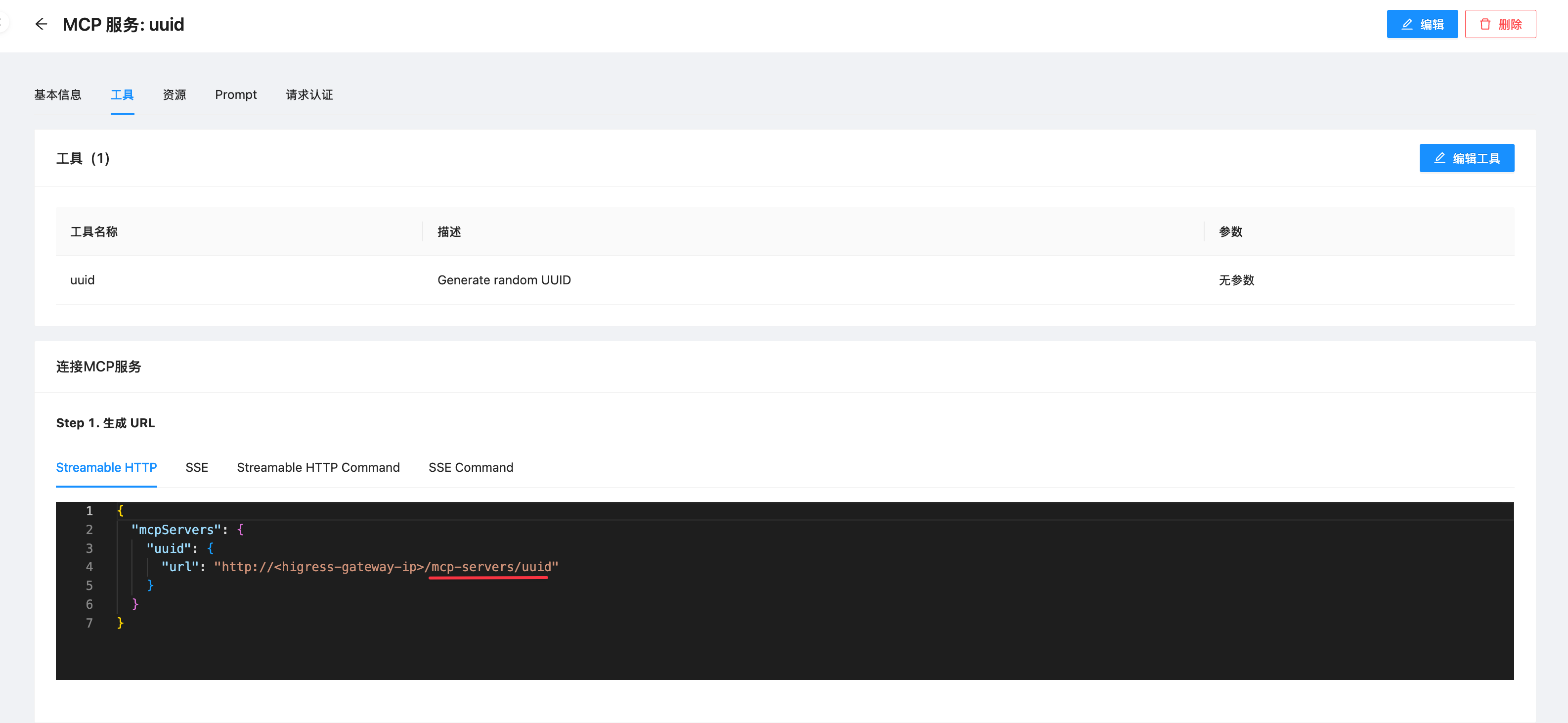 配置完成后,即可通过生成的 URL 访问该 MCP Server,访问地址为:http://<higress-gateway-ip>/mcp-servers/<mcp-server-name>