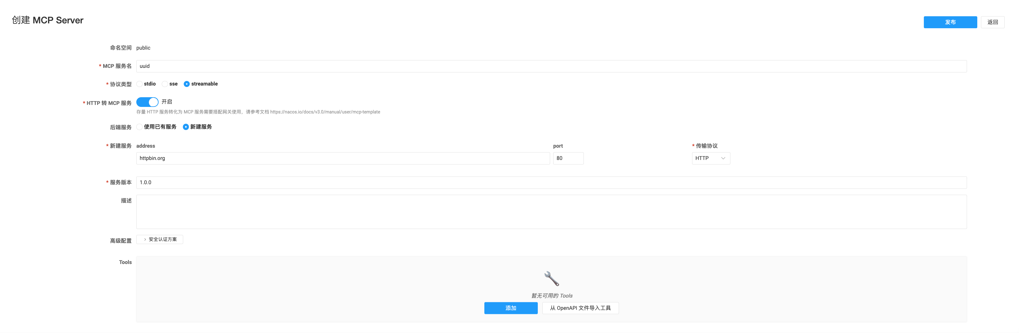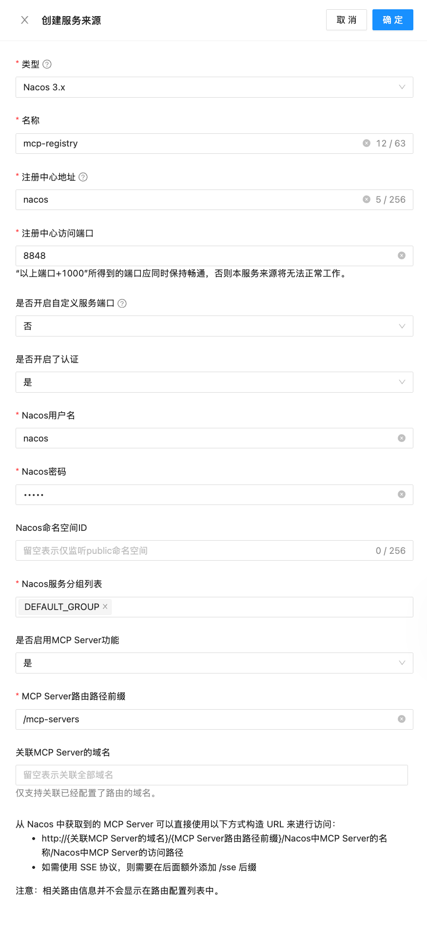 Higress 侧只需要配置 Nacos 的连接信息即可,接下来进入 Nacos 控制台继续配置 MCP Server。