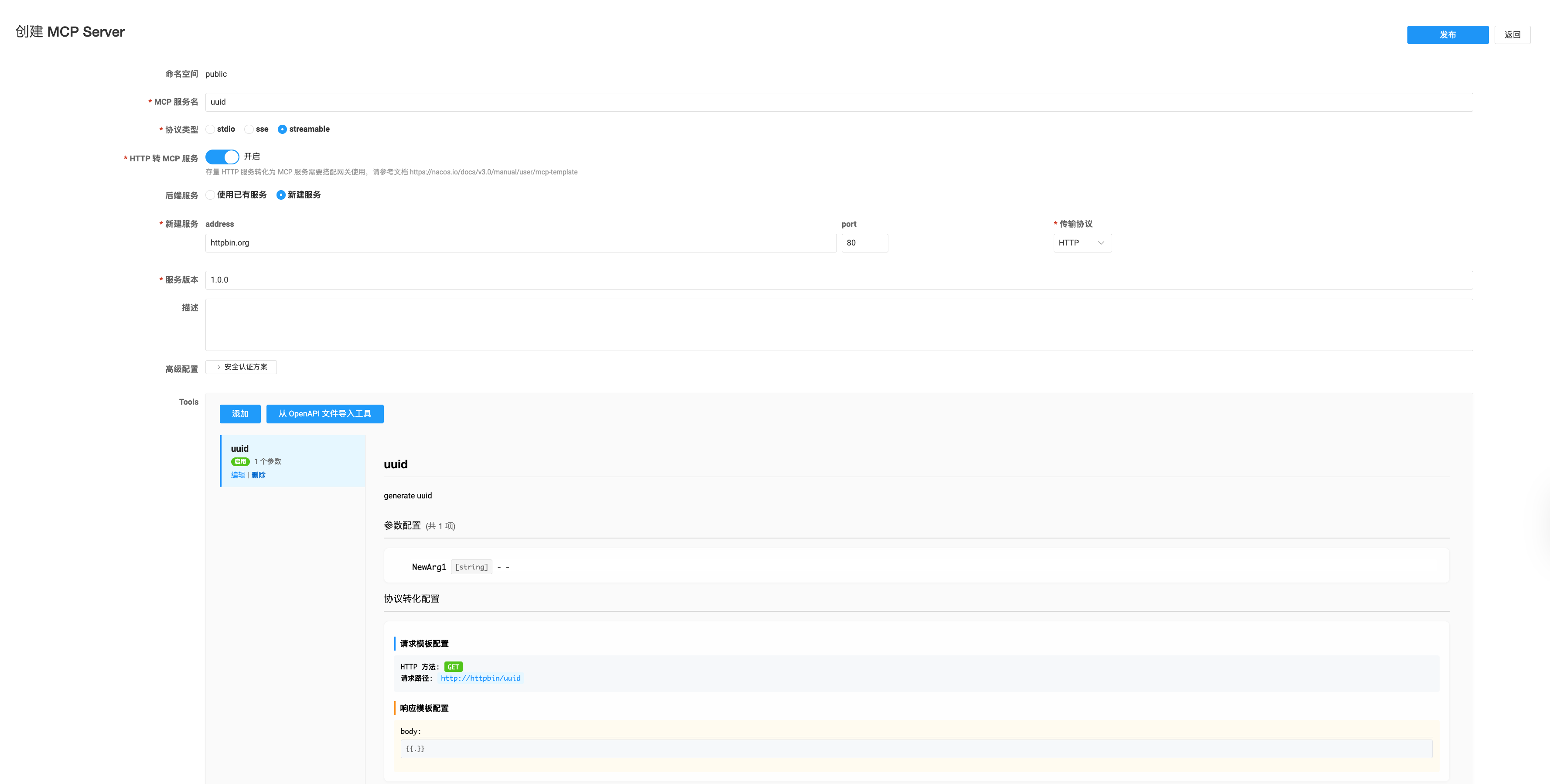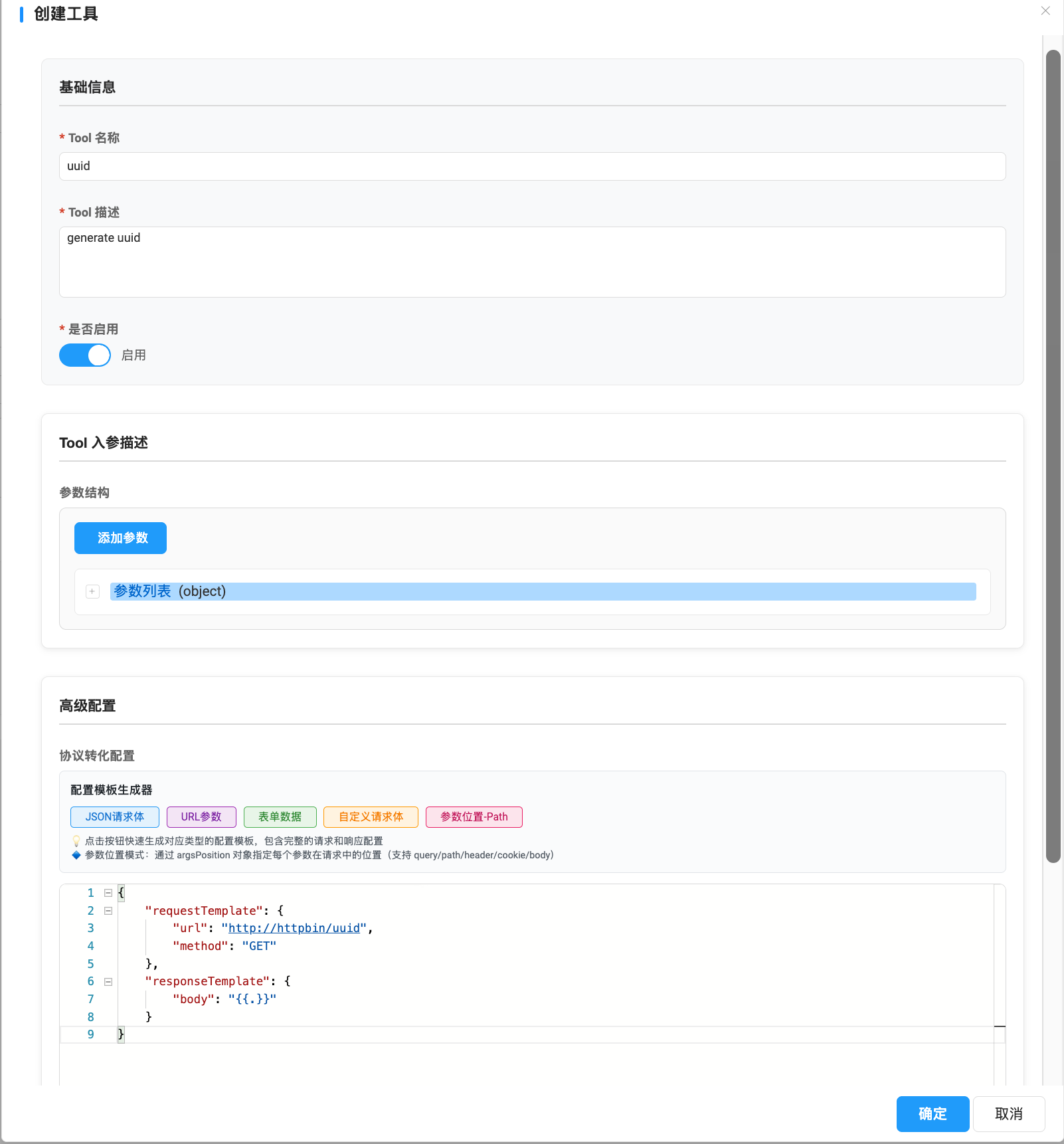 工具的参数复用 5.2 小节的 requestTemplate 和 responseTemplate 配置。