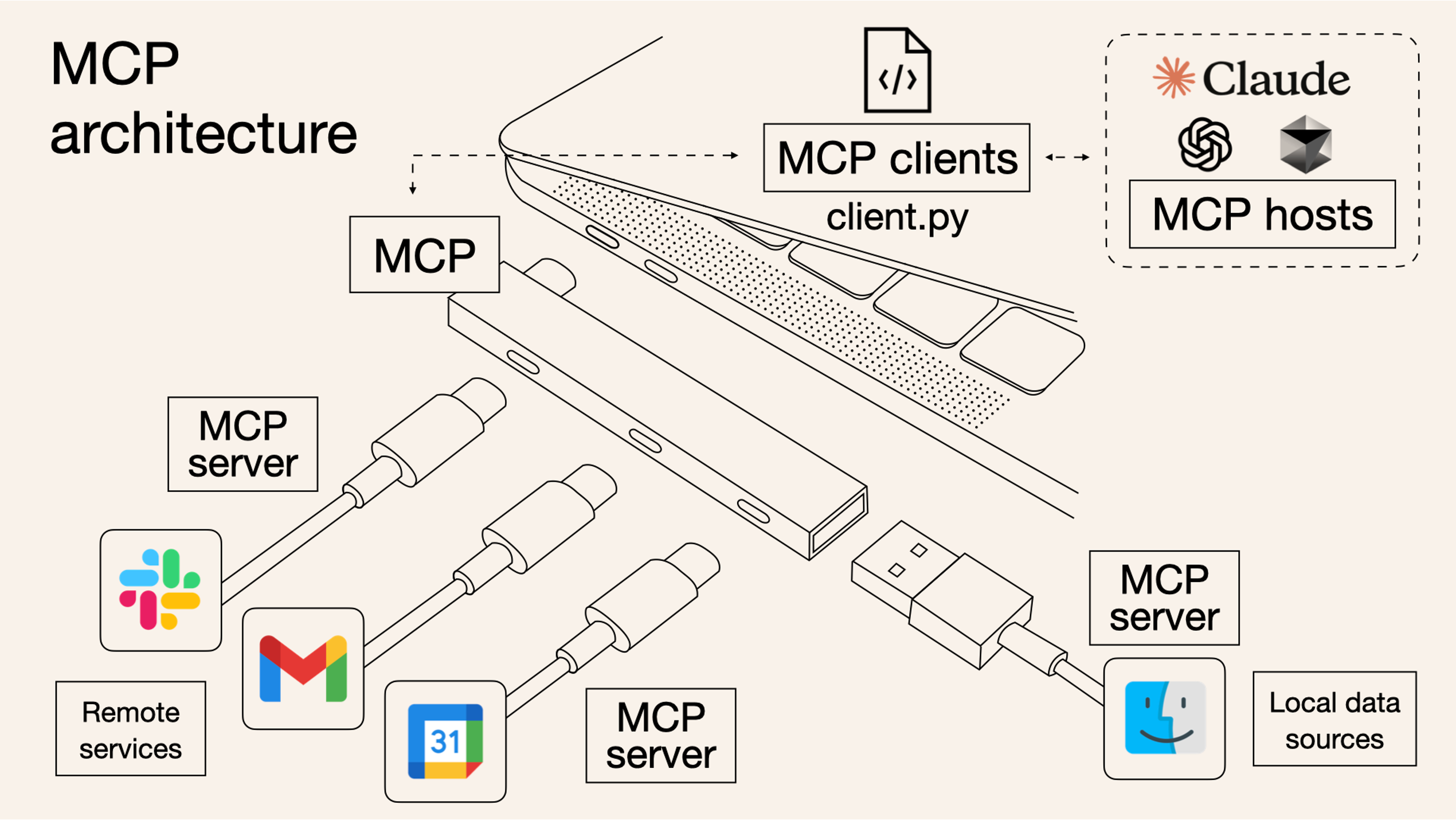 通过 MCP,任何现有系统——无论是数据库、REST API,还是内部服务——都可以被封装成 MCP Server,并被 Cursor、Claude 等兼容 MCP 的客户端直接使用。