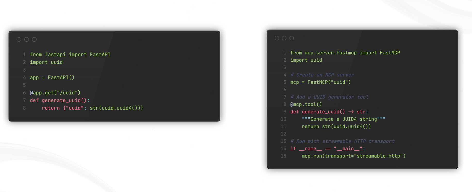 当前,如果想让 REST API 接口变成可被 AI Agent 调用的 MCP 工具,通常需要使用对应语言的 MCP SDK 来编写代码。例如下面这个例子,是一个用 FastAPI 写的简单 UUID REST API。